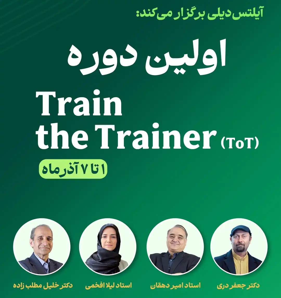 اولین دورهی train the trainer آکادمی آیلتسدیلی به صورت حضوری (به همراه ۶ جلسه کارگاه آنلاین و یک جلسه تمرین ارائه آنلاین) در شهر مشهد از ۱ آذر ماه ۱۴۰۴ لغایت ۷ آذر ماه ۱۴۰۴ (به مدت ۷ روز) برگزار خواهد شد.